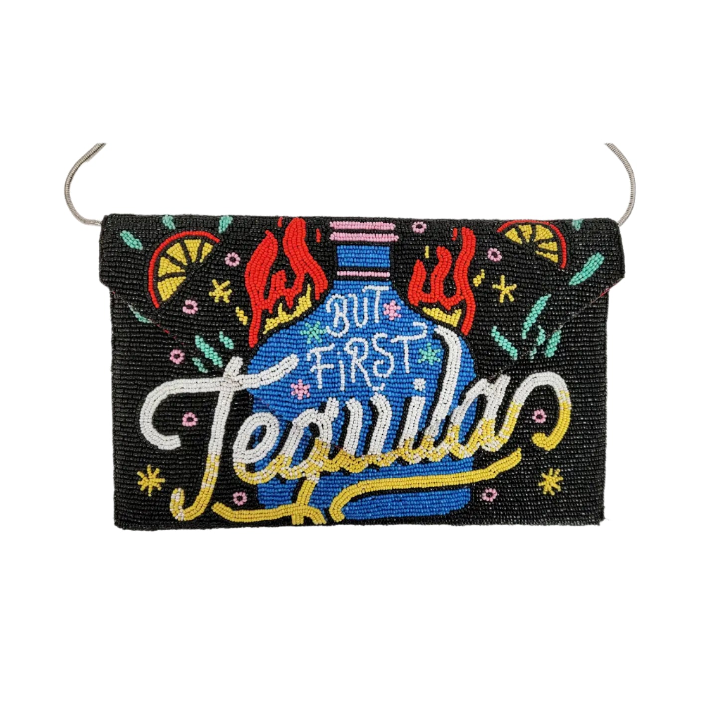Hand-crafted pop art tequila first beaded clutch with crossbody chain strap