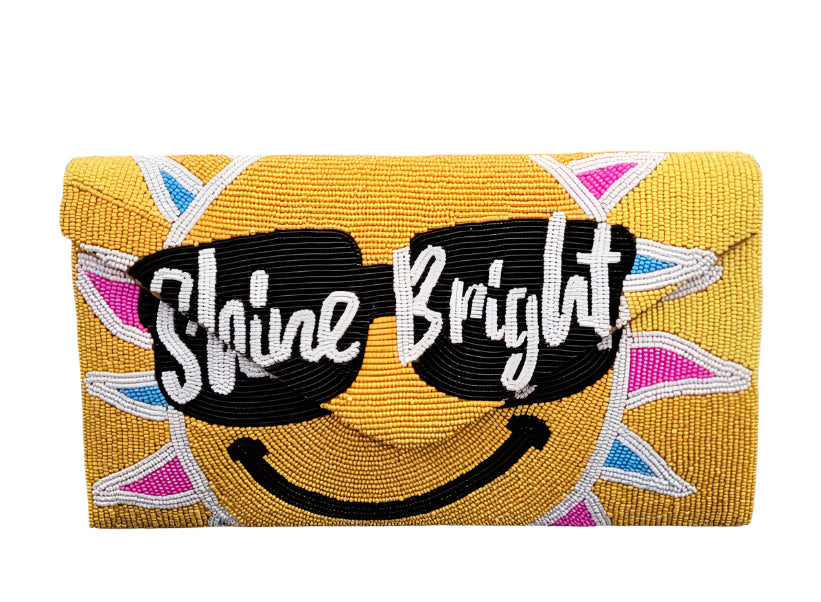 Hand-crafted pop art Shine Bright beaded clutch with crossbody chain strap