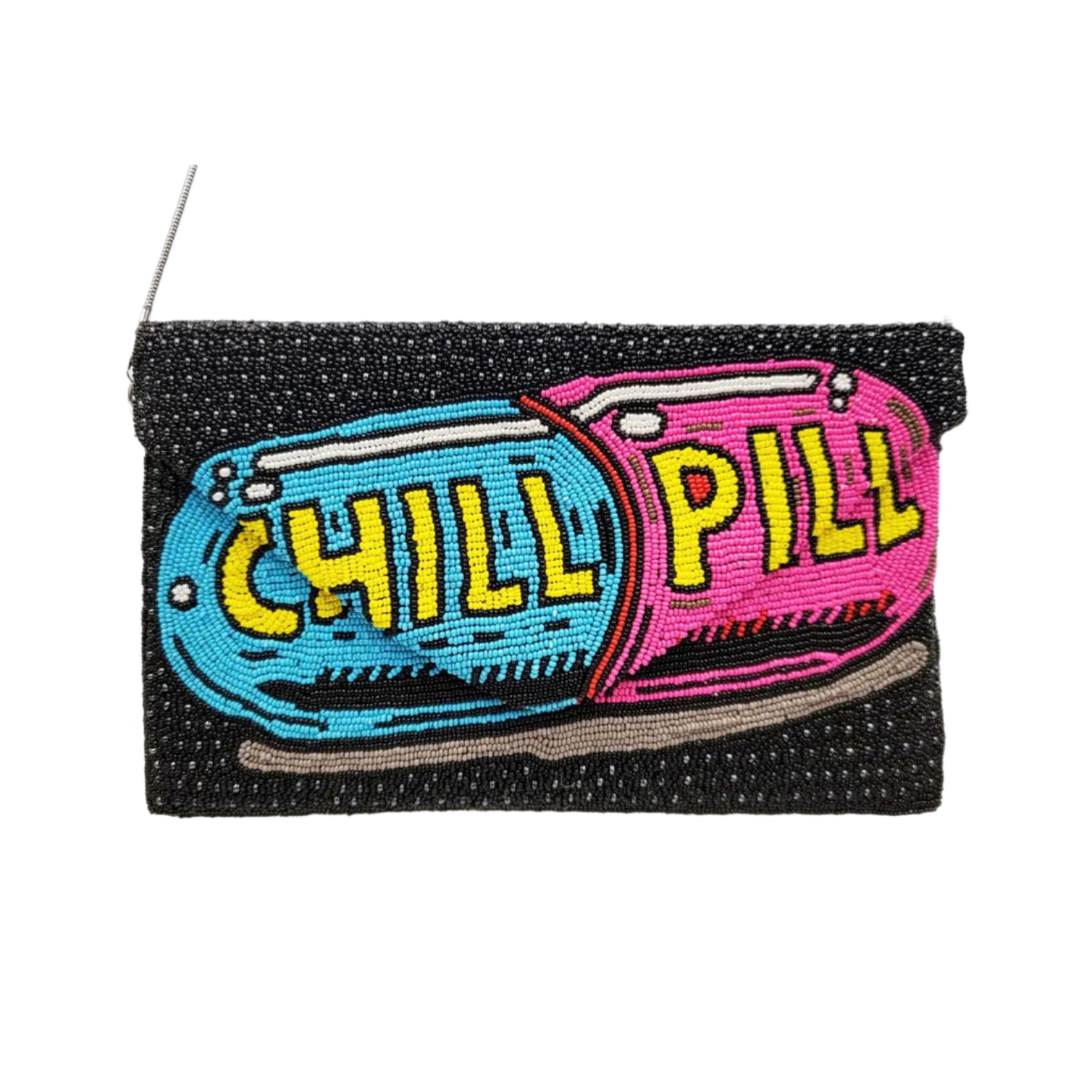 Hand-crafted pop art Chill Pill beaded clutch with crossbody chain strap