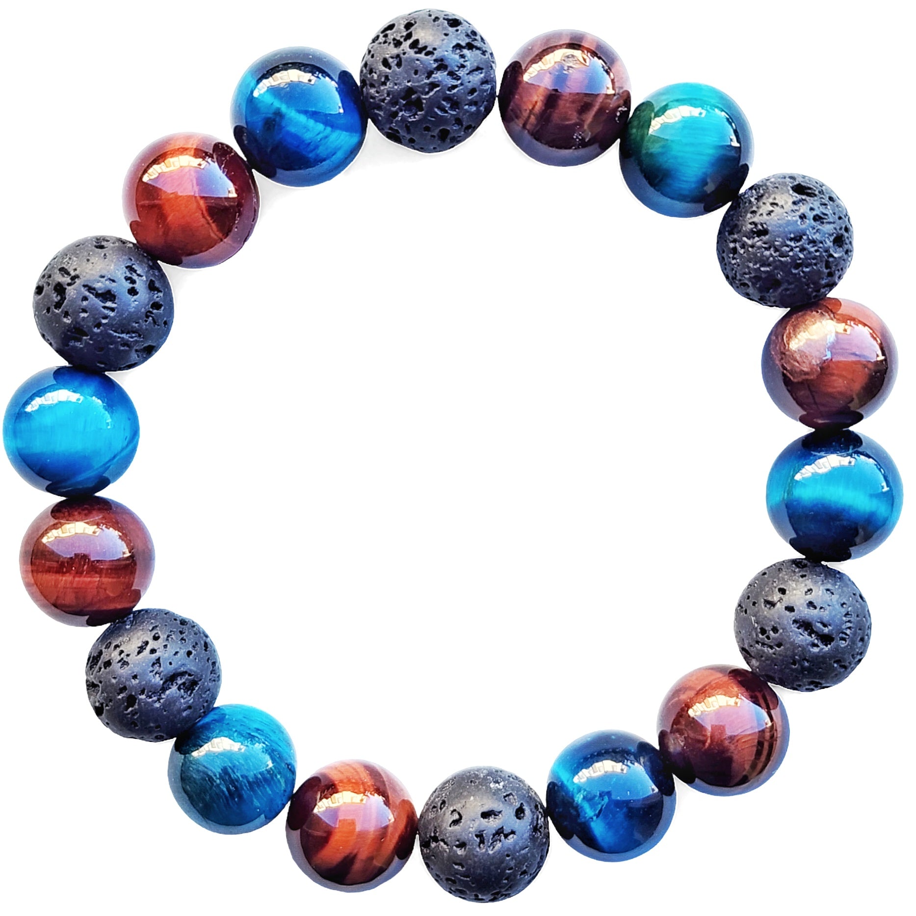 Blue Tiger's Eye, Red Tiger's Eye and Lava Rock Unisex Reiki Healing Beaded Gemstone Bracelet