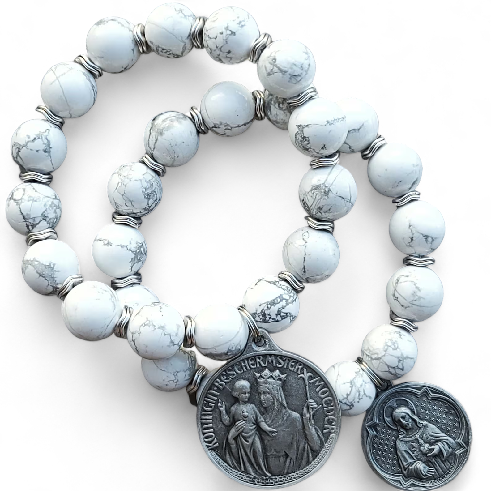Experience the healing power of these bracelets, featuring Howlite gemstones adorned with the Sacred Heart of Jesus and Immaculate Heart of Mary.