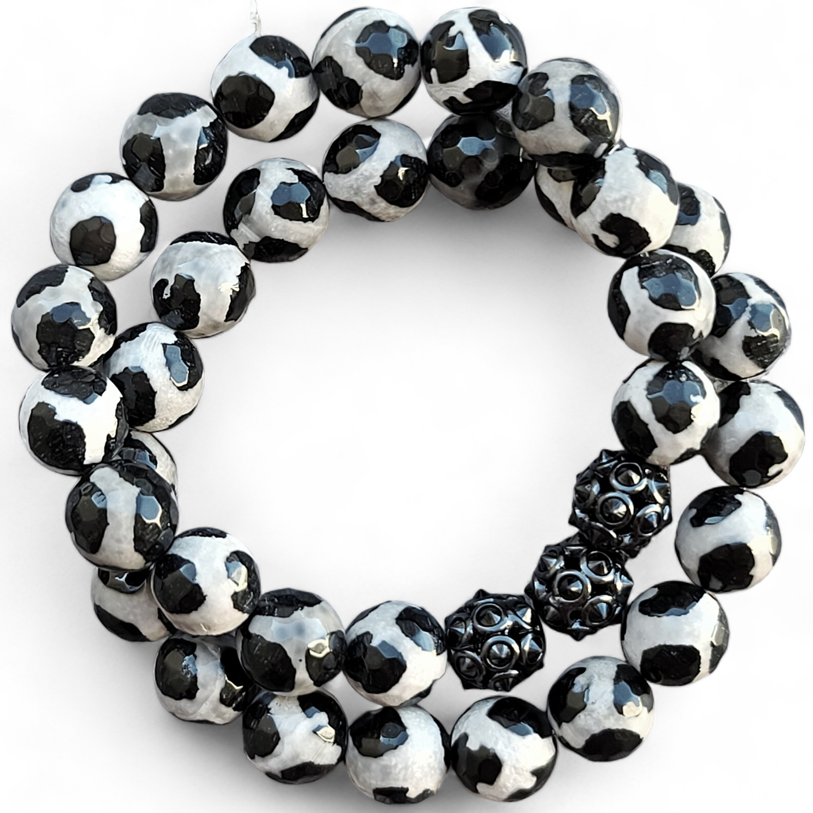 This playful DZI Agate bracelet features striking black and white beads, highlighted with edgy spike accents for a bold, fun look.