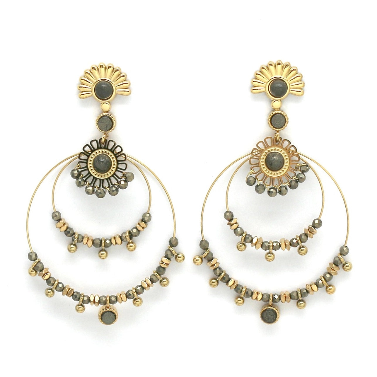 Featuring shimmering pyrite stones set in a playful double hoop design, these earrings catch the light beautifully with every turn.