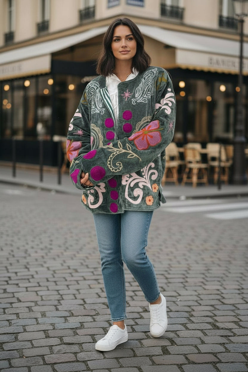 Crafted by hand in India, the Velvet "Love" Jacket celebrates artisanal skill and eco-conscious style.