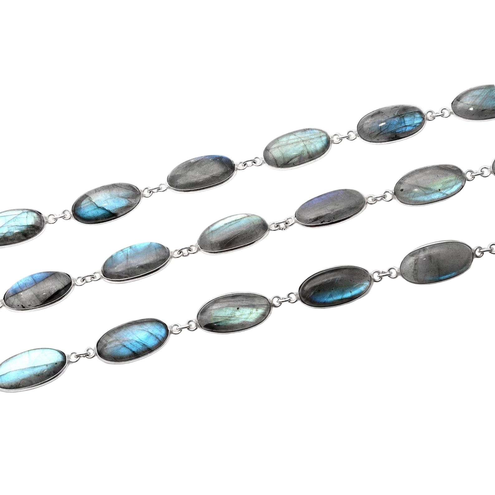This necklace features stunning teardrop-shaped Labradorite stones that catch the light with dazzling flashes of blue.