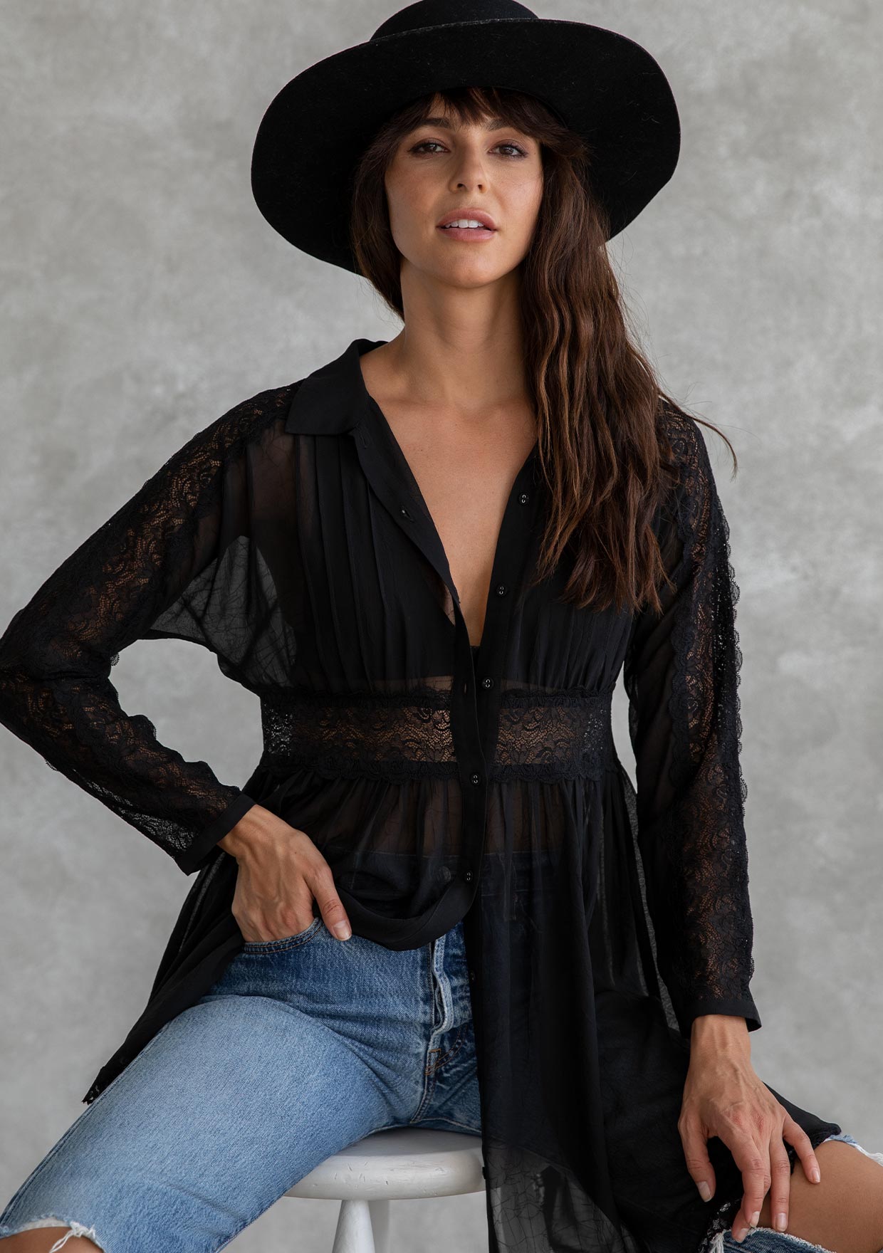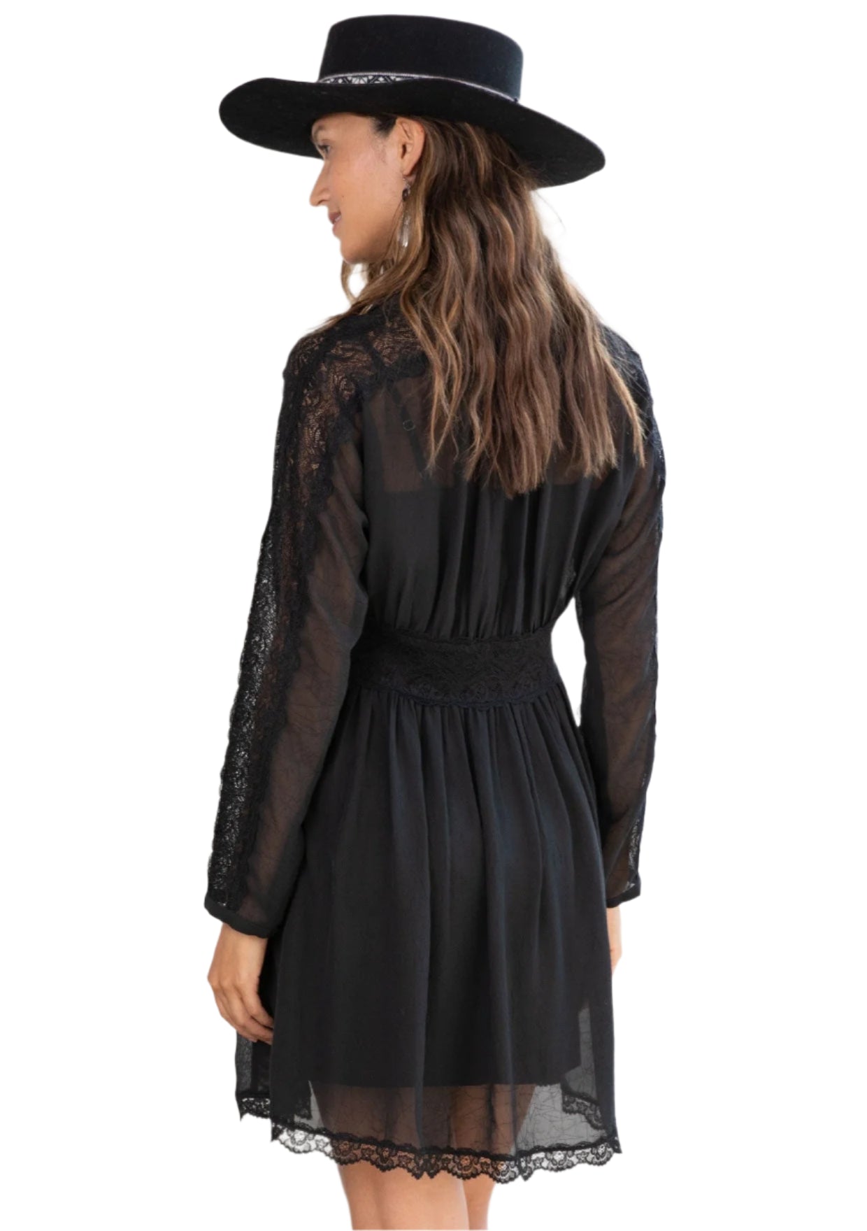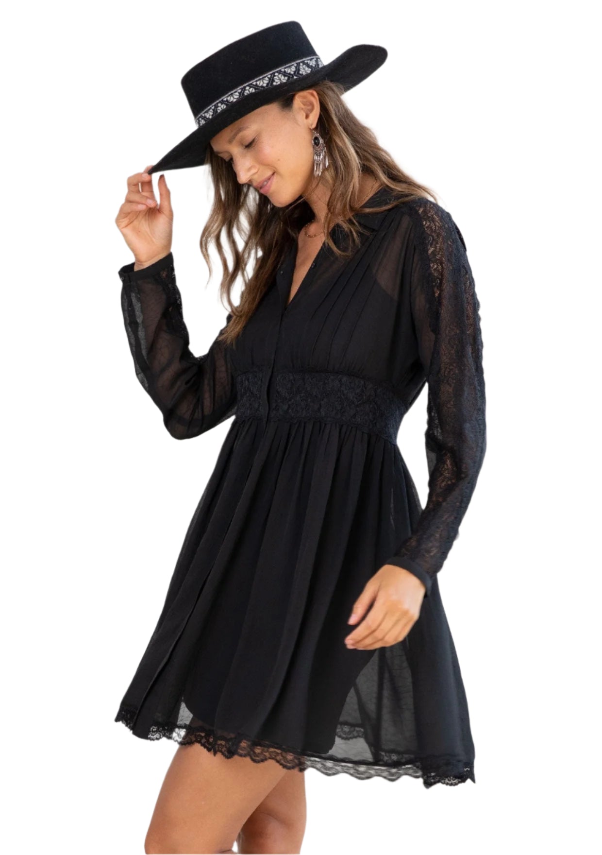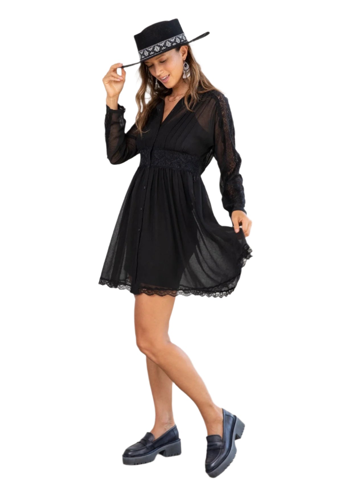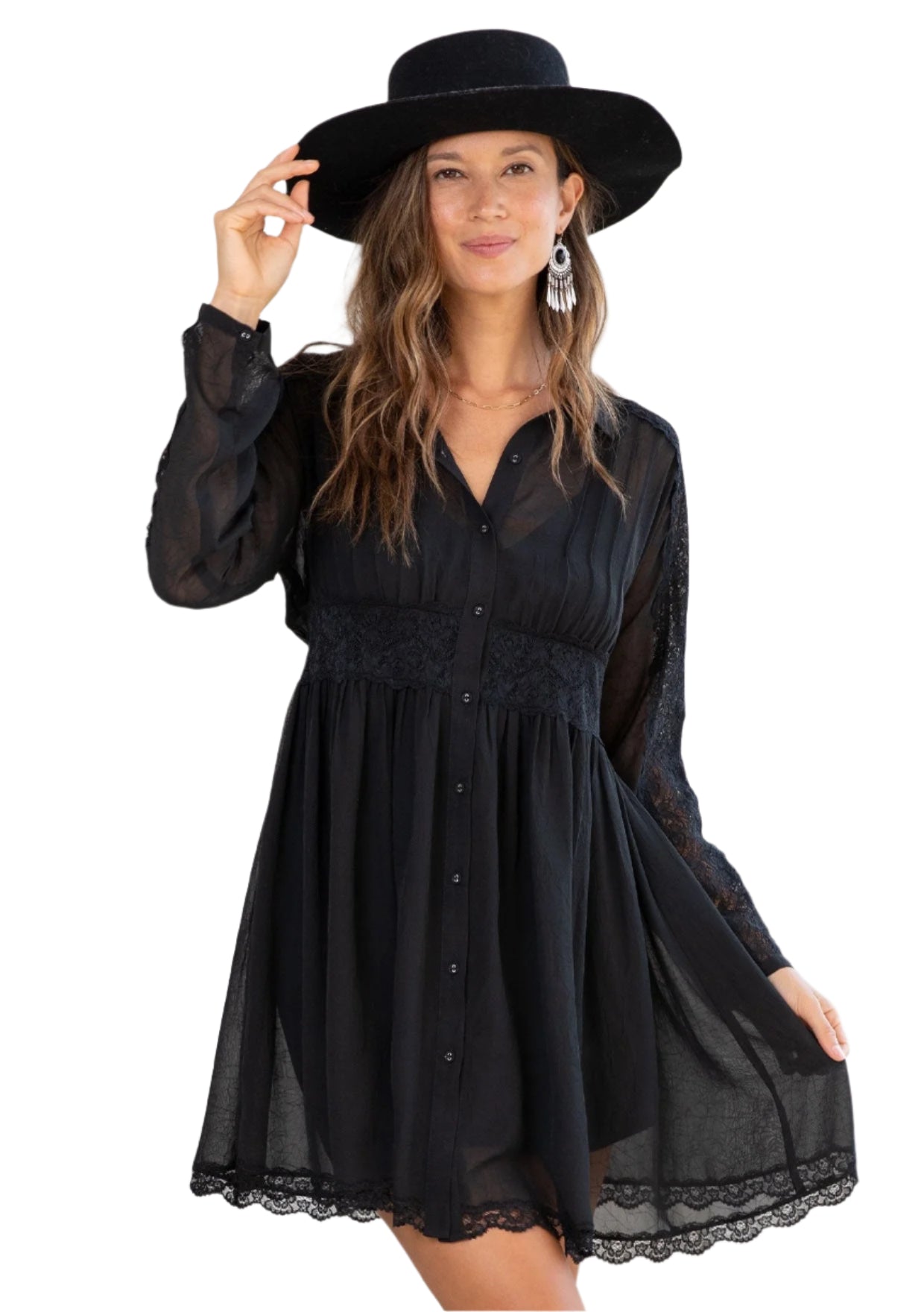 This charming boho mini shirt dress shines with delicate lace accents on the sleeves and waist, paired with a classic collar and long sleeves.