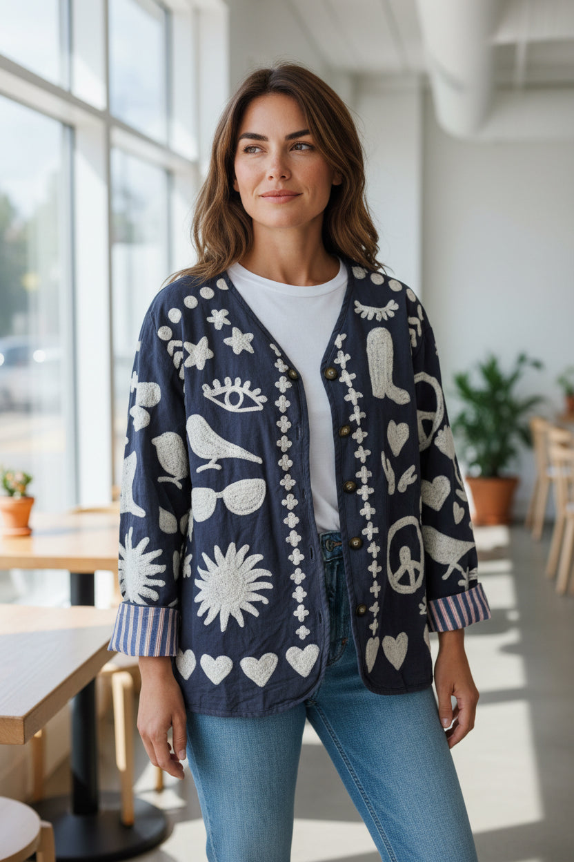 Crafted by hand in India, the Velvet "Love" Jacket celebrates artisanal skill and eco-conscious style.