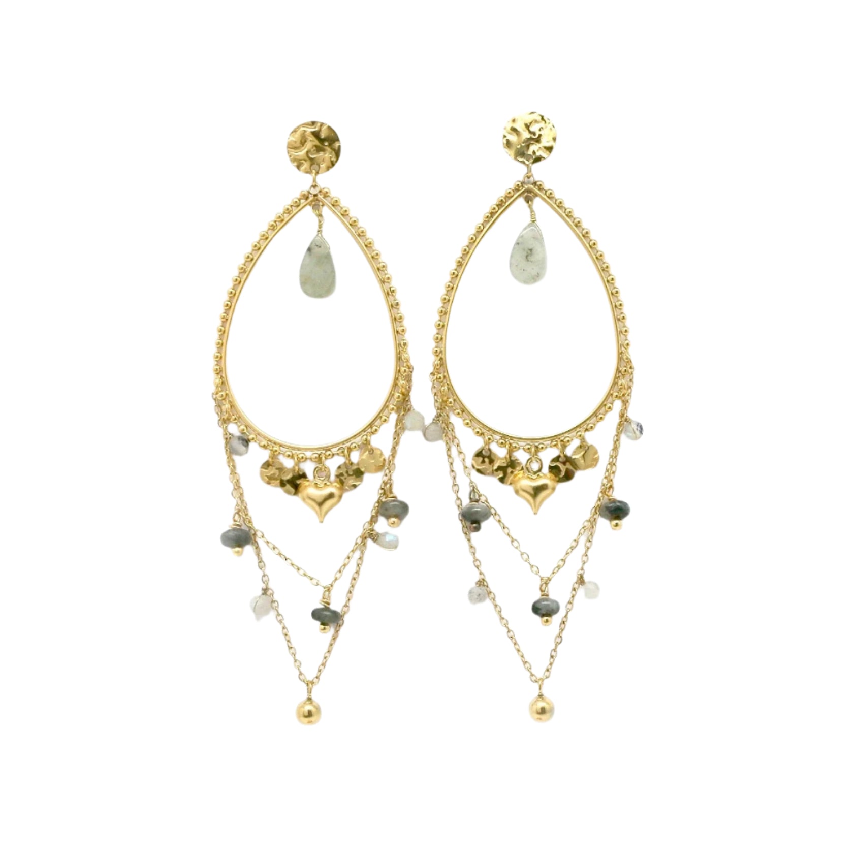 Each earring features a shimmering Labradorite stone that dances with flashes of color, set in elegant gold that catches the light beautifully.