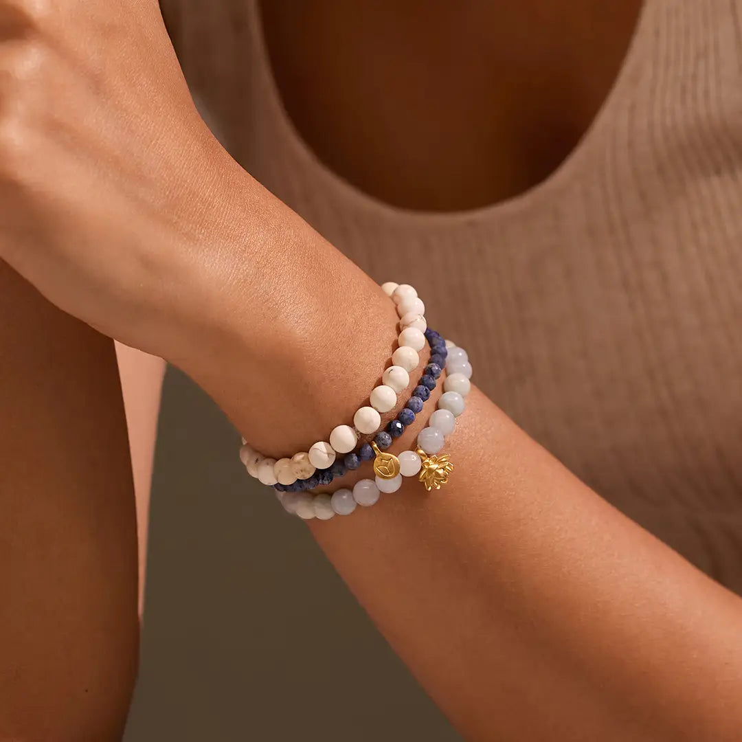 With Aquamarine, Magnesite, and Dumortierite, these bracelets tap into the energy of tranquility, health, and positivity.