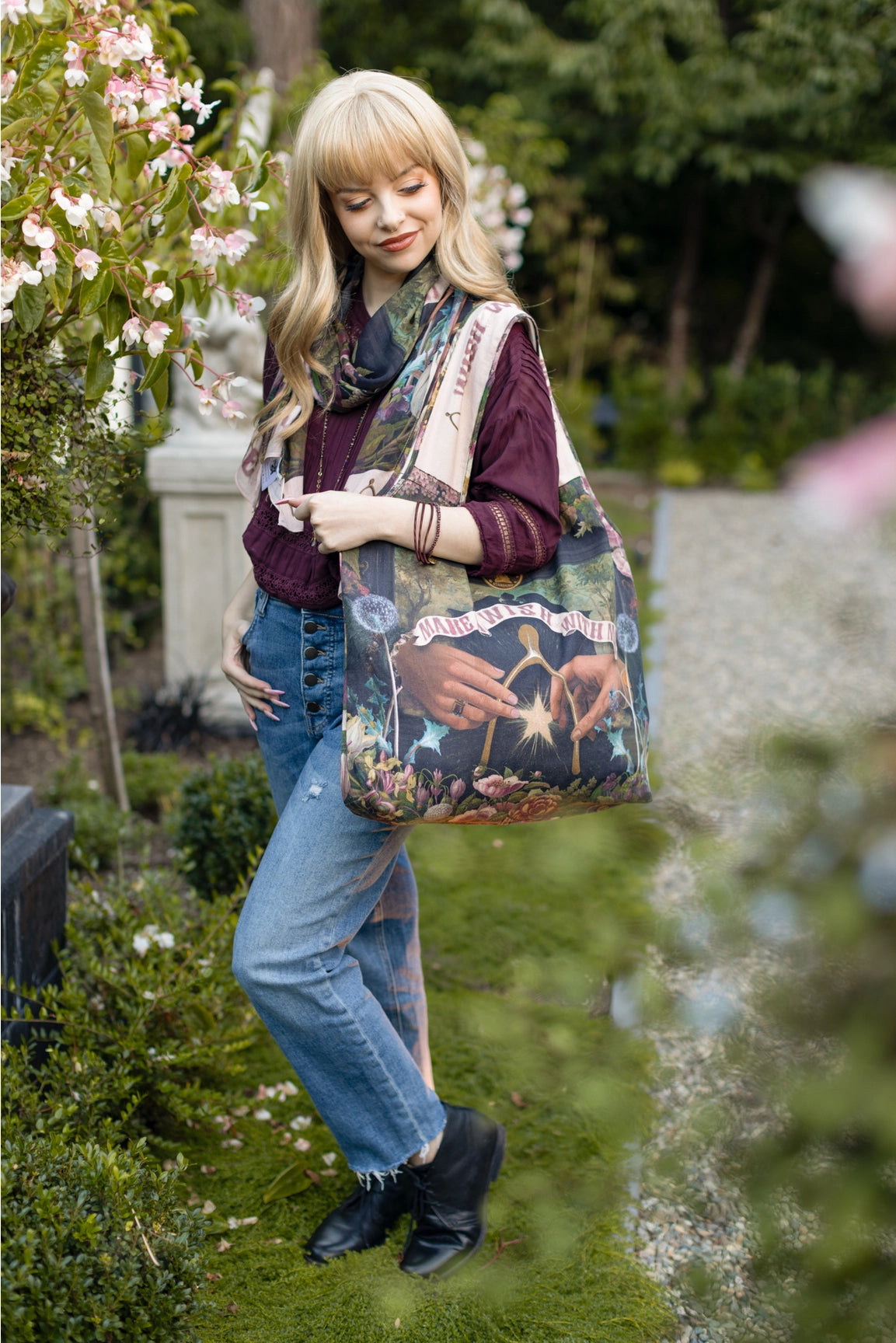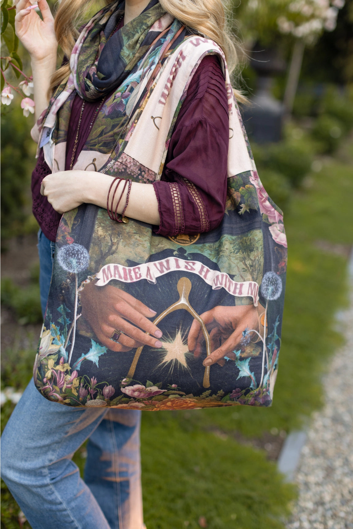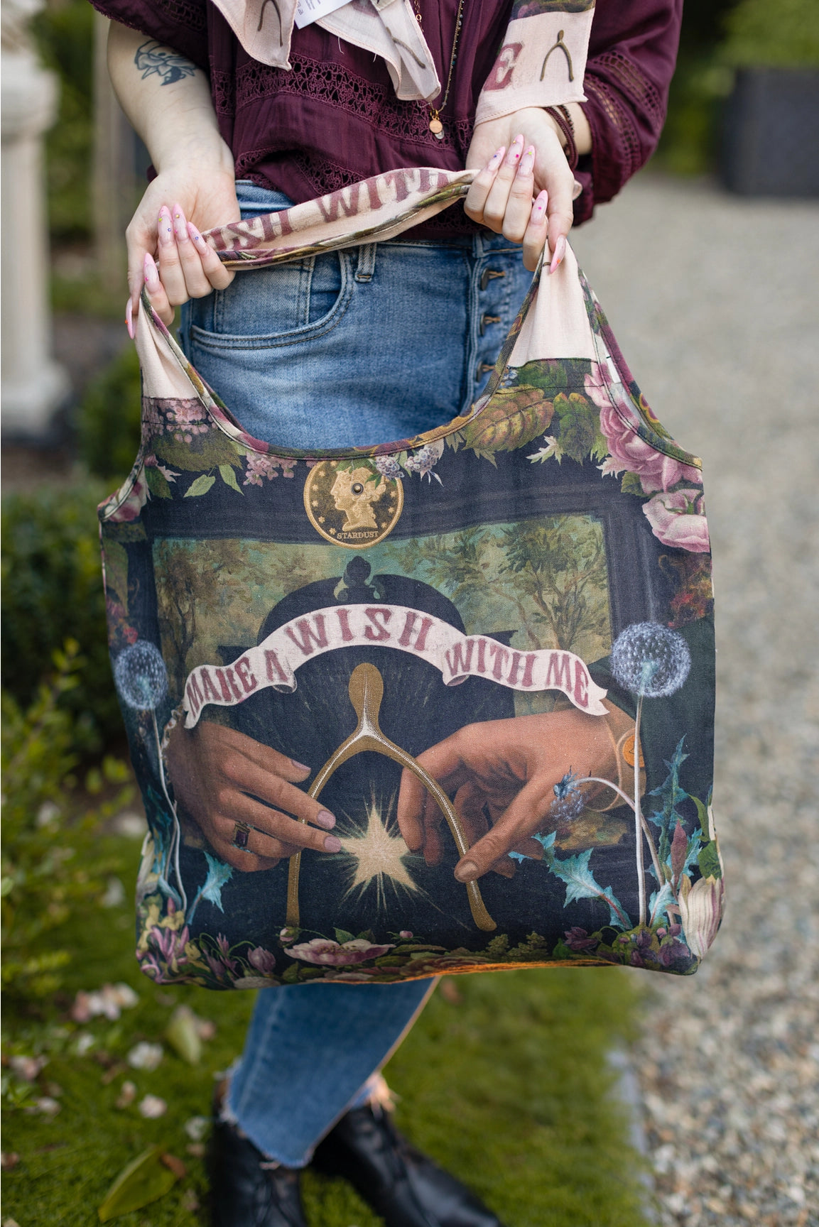 Market Of Stars Make A Wish Floral Boho Linen Tote Bag With Wishbone & Dandelion