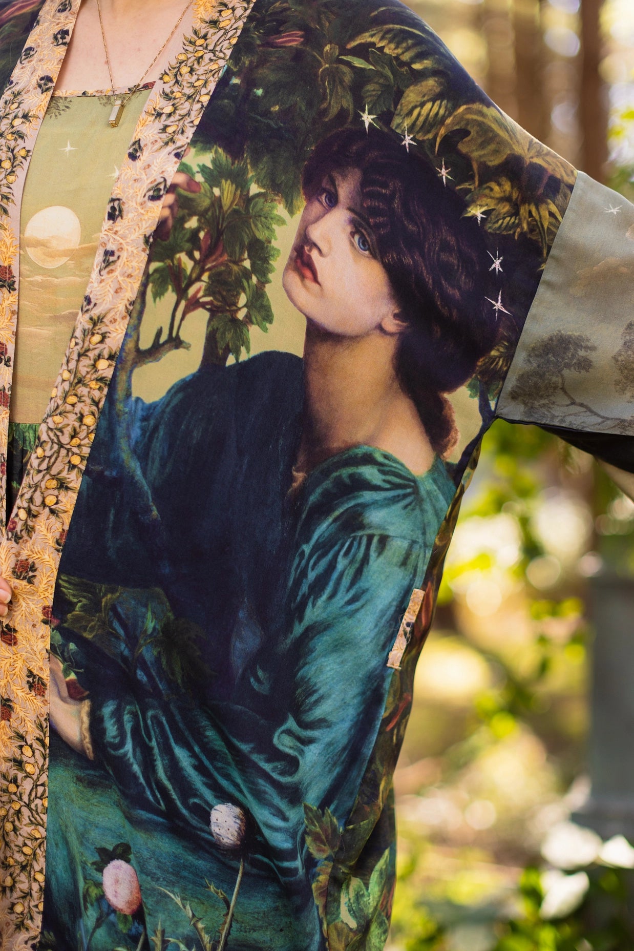 The seated woman in the trees with her dreamy, faraway gaze was painted in 1880 by artist & poet Dante Gabriel Rossetti, while the charming rabbit comes from a much earlier painting done in 1585.