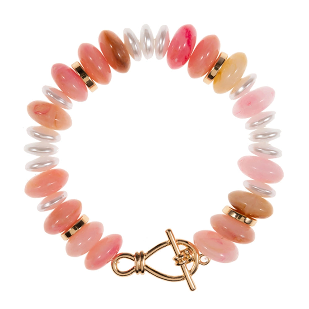 Chunky toggle bracelet featuring a mix of glossy stone-look disc beads and lustrous shell accents.