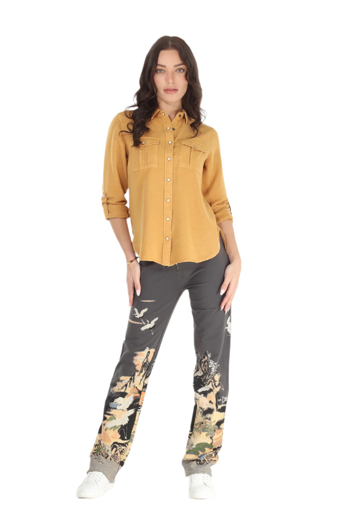 Stretch French Terry, Pull-on Zen print lounge pant, multi-color crane print leg, elastic and drawstring waist, raw edge hem.