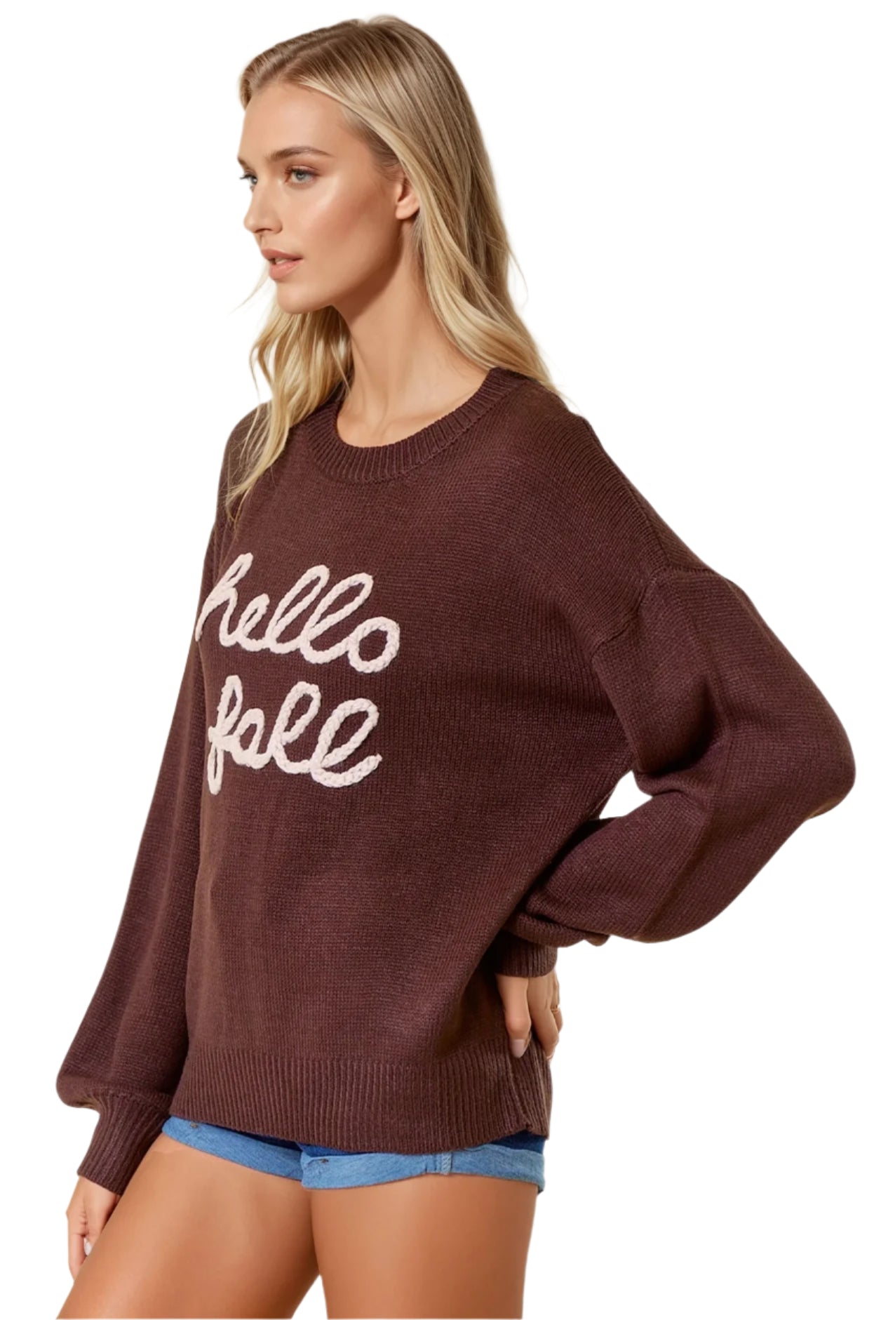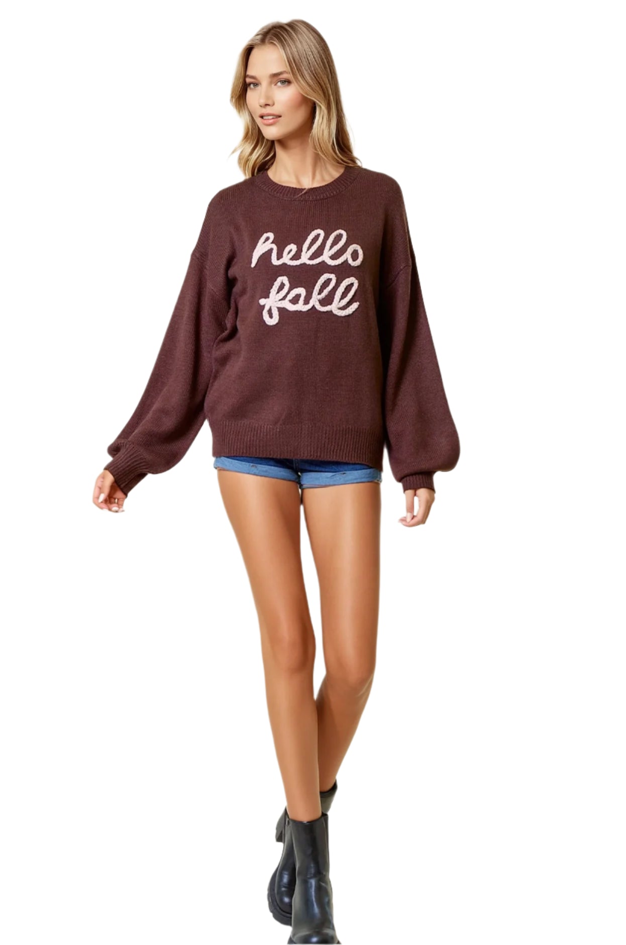 Get cozy and stylish with this oversized sweater top featuring the playful 'Hello Fall' letter embroidery.