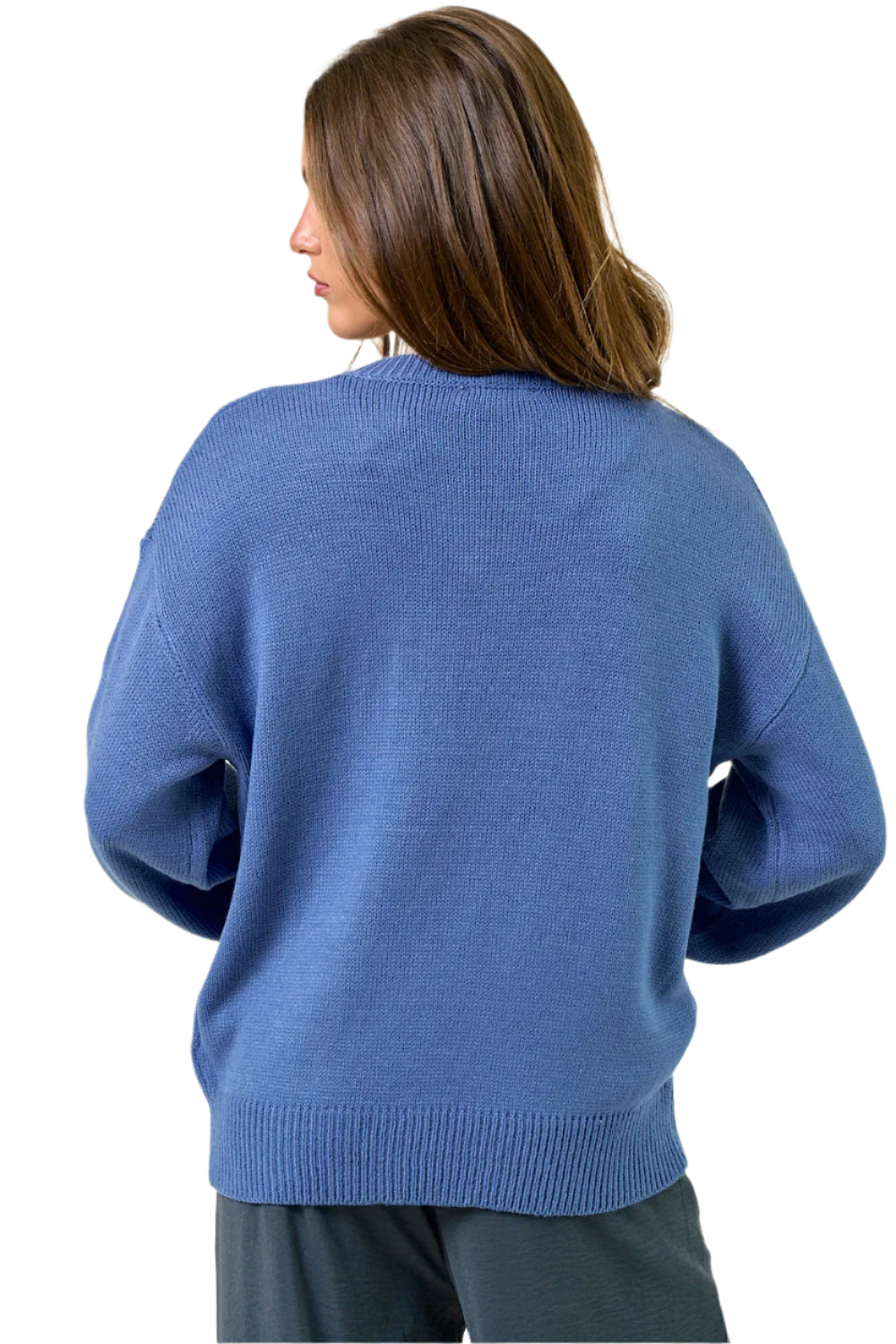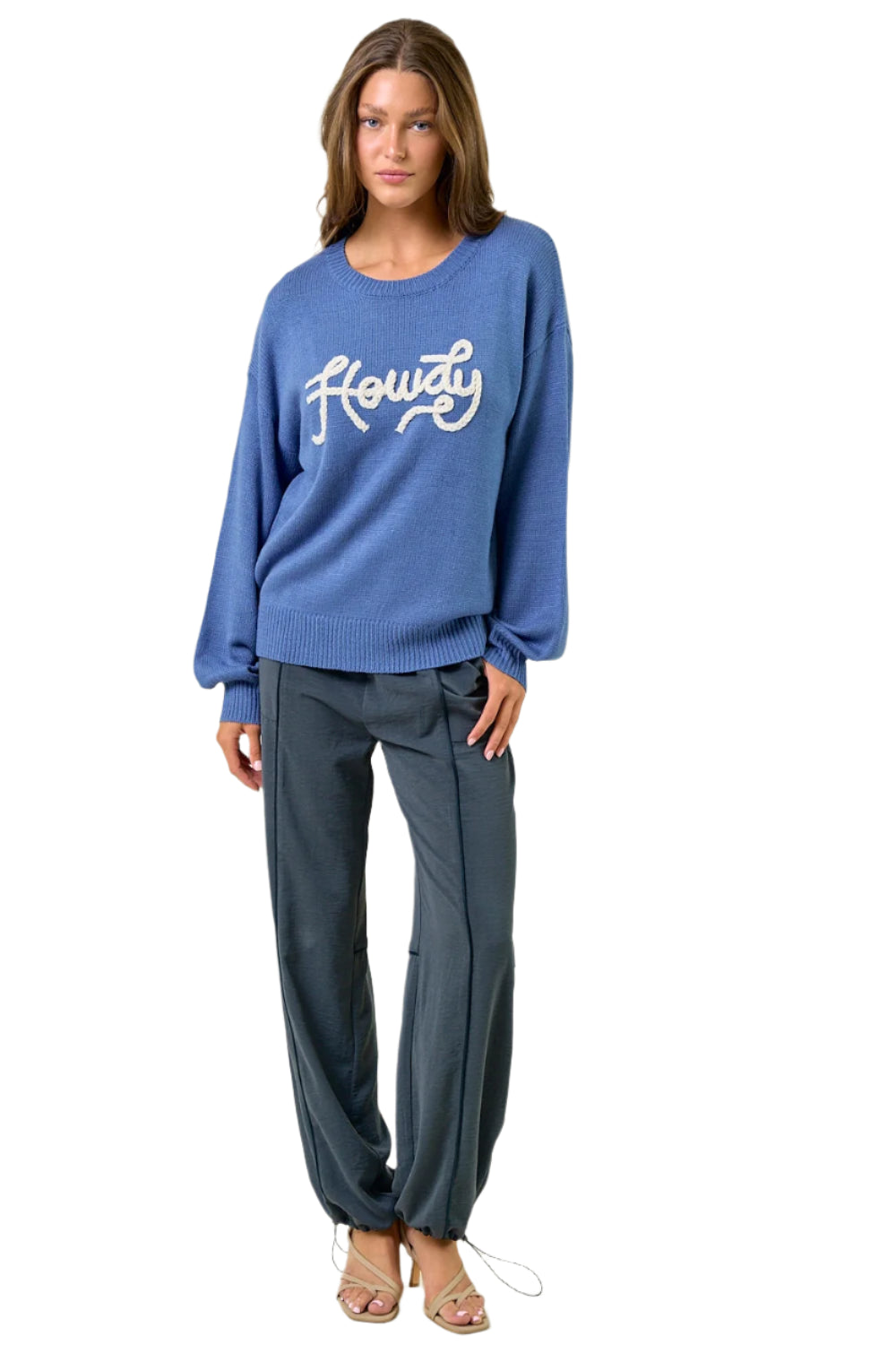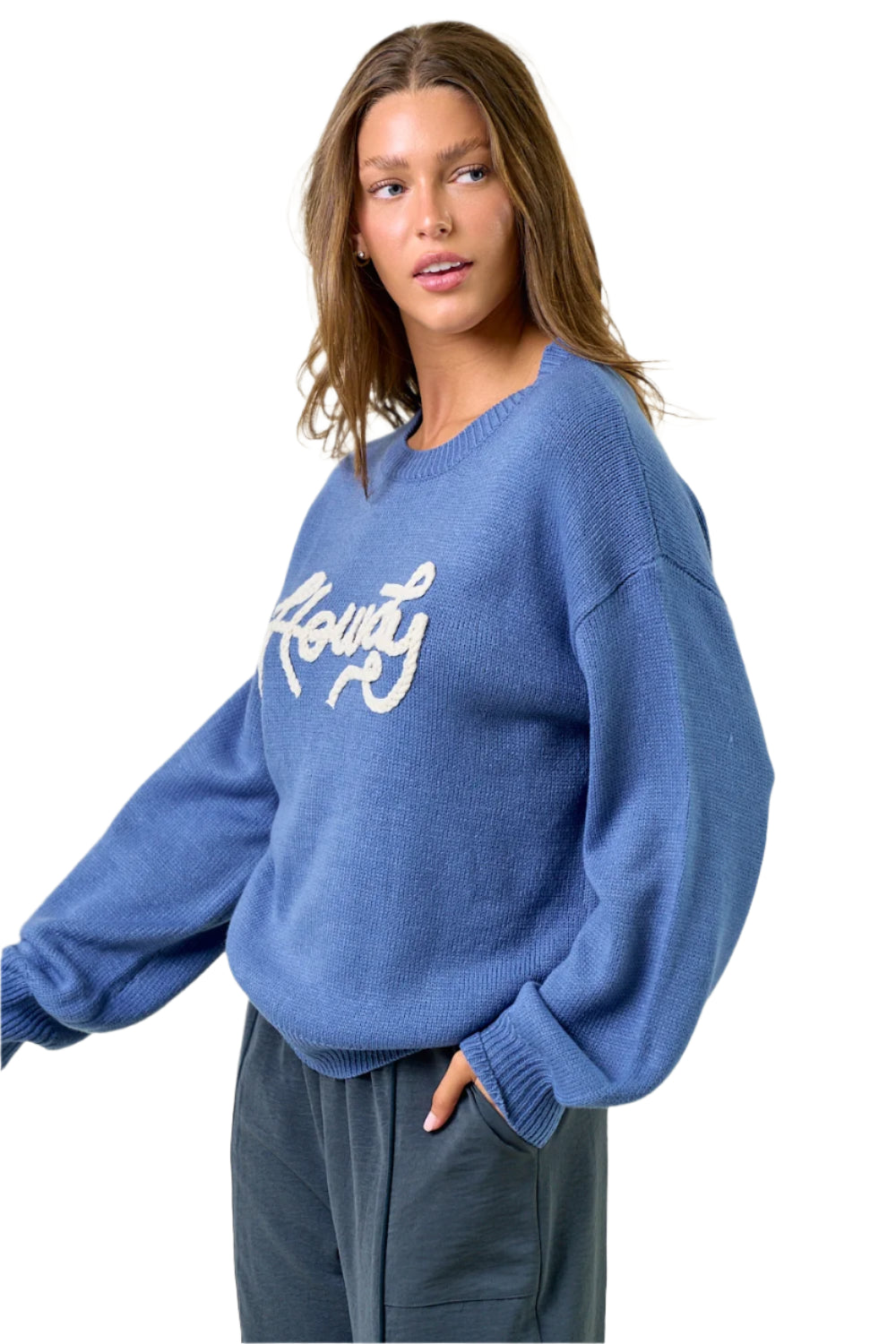 This adorable sweater features a bold "Howdy" letter embroidery across the front for a playful, trendy look.