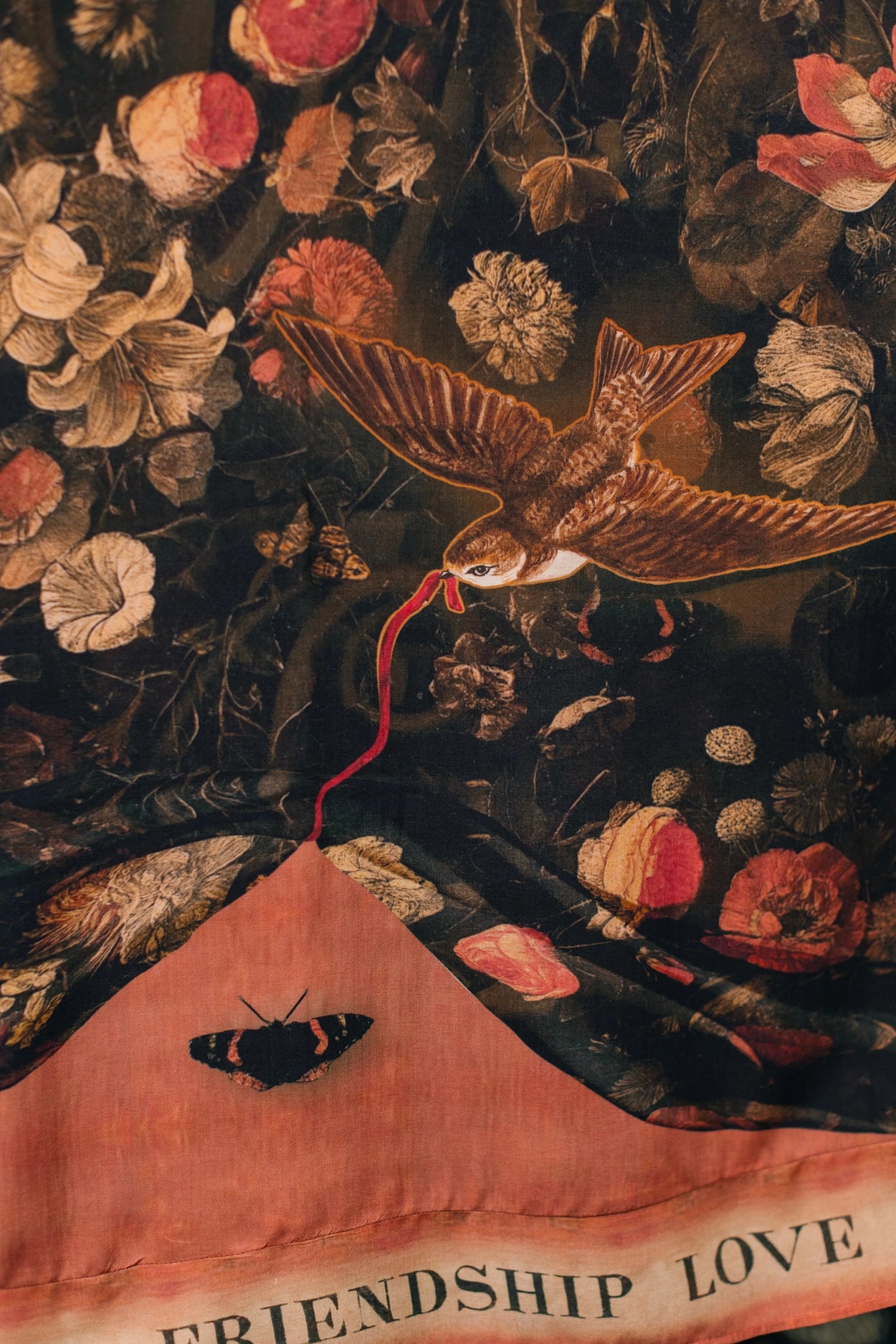 Designed using an intricate collage, it features hand-painted swallows from an 1865 scrapbook, floral wreaths done in the 1600s, and a very special sacred heart from Notre Dame in France, which was embroidered with gilded thread and completed in 1872.