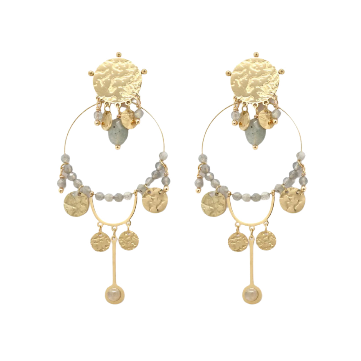 Each earring features a shimmering Labradorite stone that dances with flashes of color, set in elegant gold that catches the light beautifully.