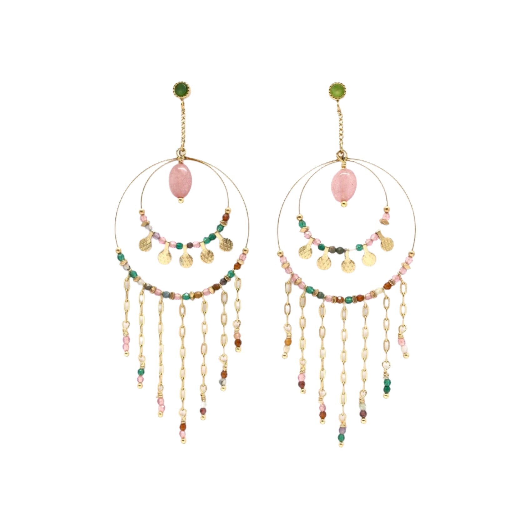 Add a splash of bold elegance to your look with these Unique Double Hoop Tourmaline Stone Metal Fringe Dangle Earrings.
