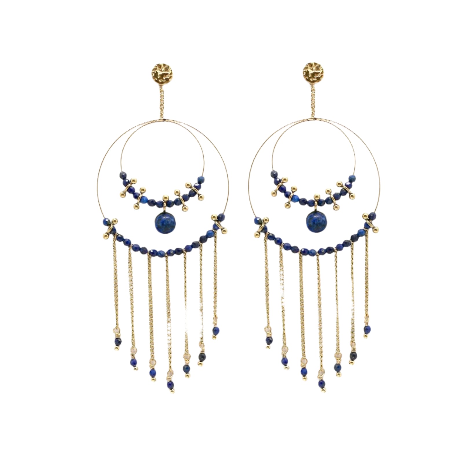 Featuring vibrant lapis stones nestled within two shimmering metal hoops, these earrings dance with playful fringe that catches the light and attention.