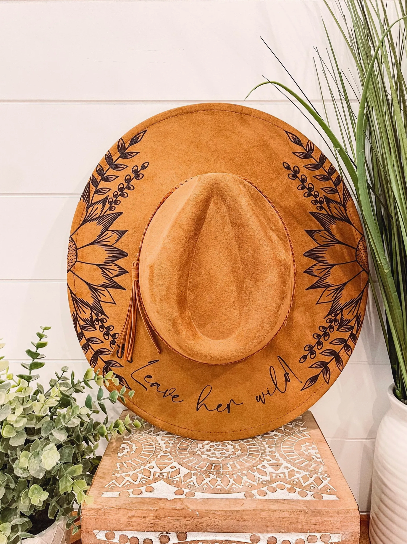 Leave Her Wild Floral Burned Hat, Floral Engraved Cowboy Hat, Sunflower Hat, Sunflower Burned Fedora, Engraved Suede Hat, Boho Hat, Vegan Suede